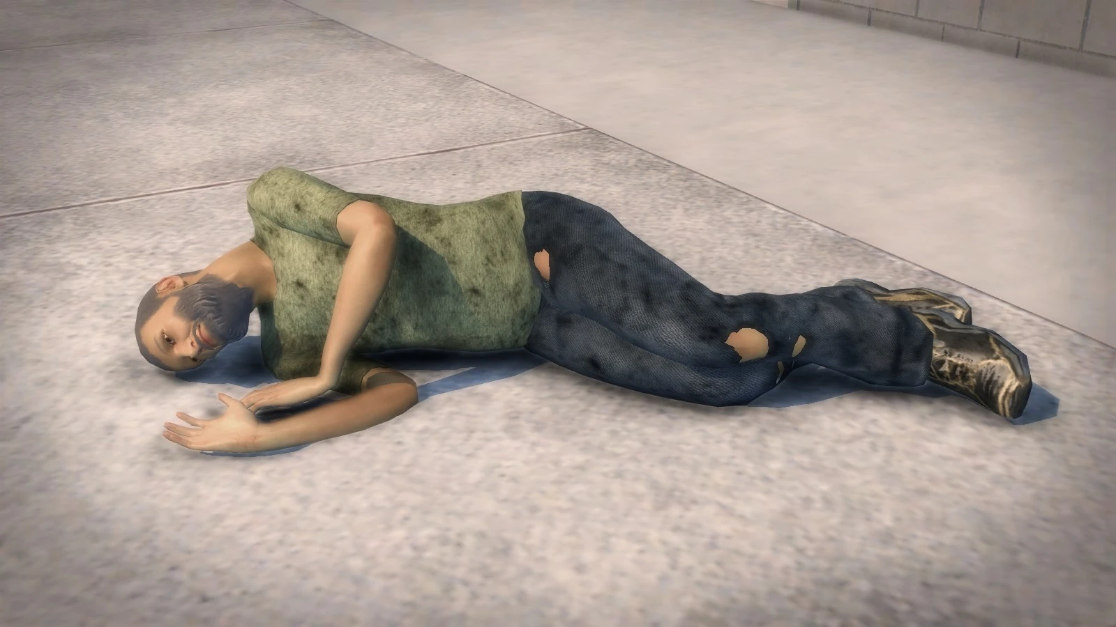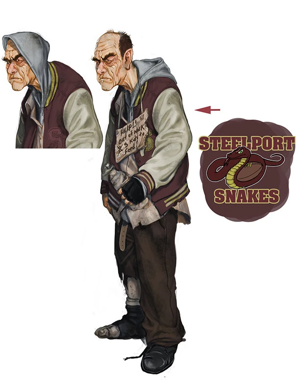 Bums in Steelport normally sleep on benches anywhere in the city except Arapice Island after the zombie outbreak and keeping warm next to burning oil drum. Many times, bums hang out on various seedy peers throughout the city, especially in Sunset Park. Many bums are located on Magarac Island. If a Bum is sleeping on a bench, it is possible to wake them up by hitting them or aiming a gun at them.