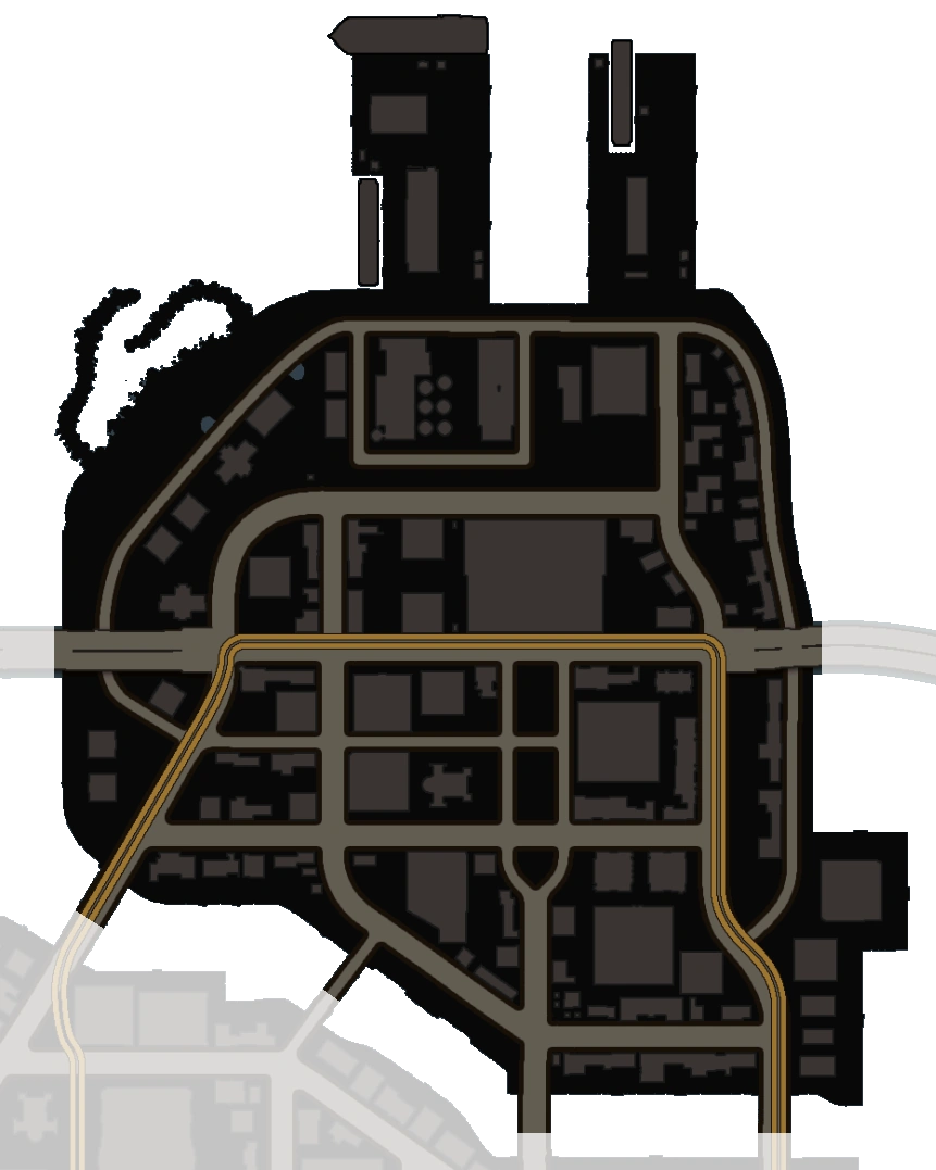 - The two factory blocks below the two Northern piers are completely reworked. The shaft on a diagonal track from East to West above the road is no longer present. The waste pile in the Southeast remains default in its unkempt state, however.