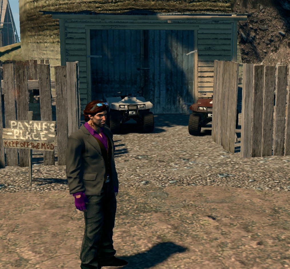 Northwest of the Trafficking activity is a small building with a sign "Payne's Place - keep off the mud". The sound of barking dogs comes from inside the building. There are also 2 Toads parked outside.