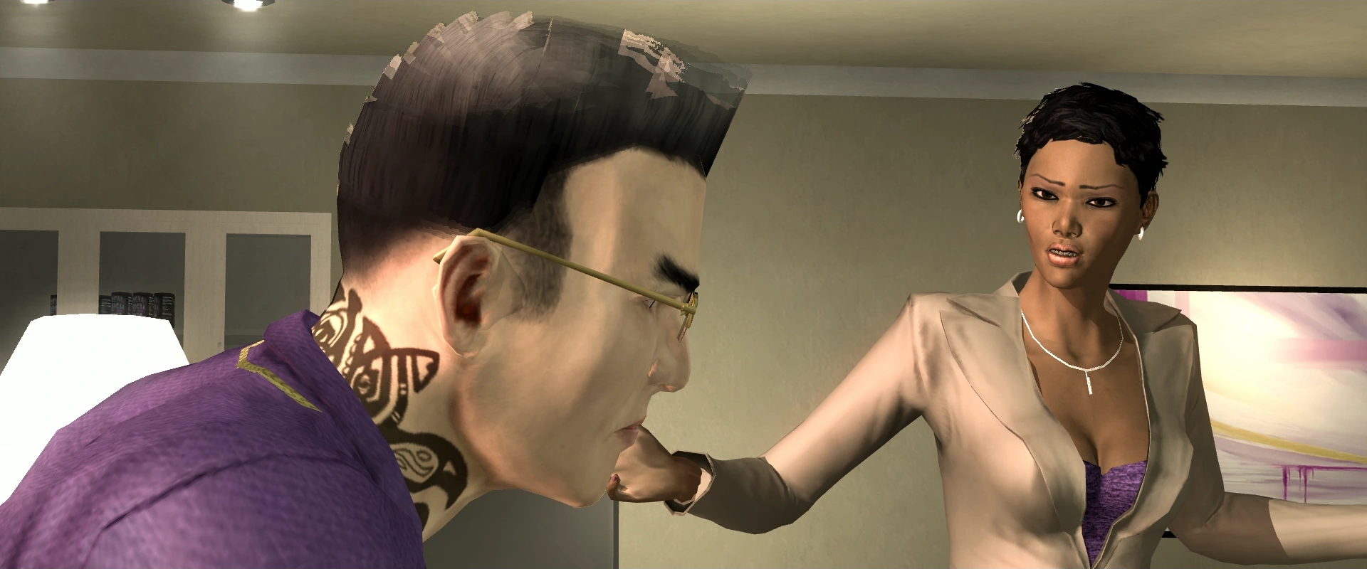At Aisha's house, Playa, Pierce, and Johnny Gat decide that, after the heist they pulled at The Ronin-controlled Poseidon's Palace, they should clean the money.[1]