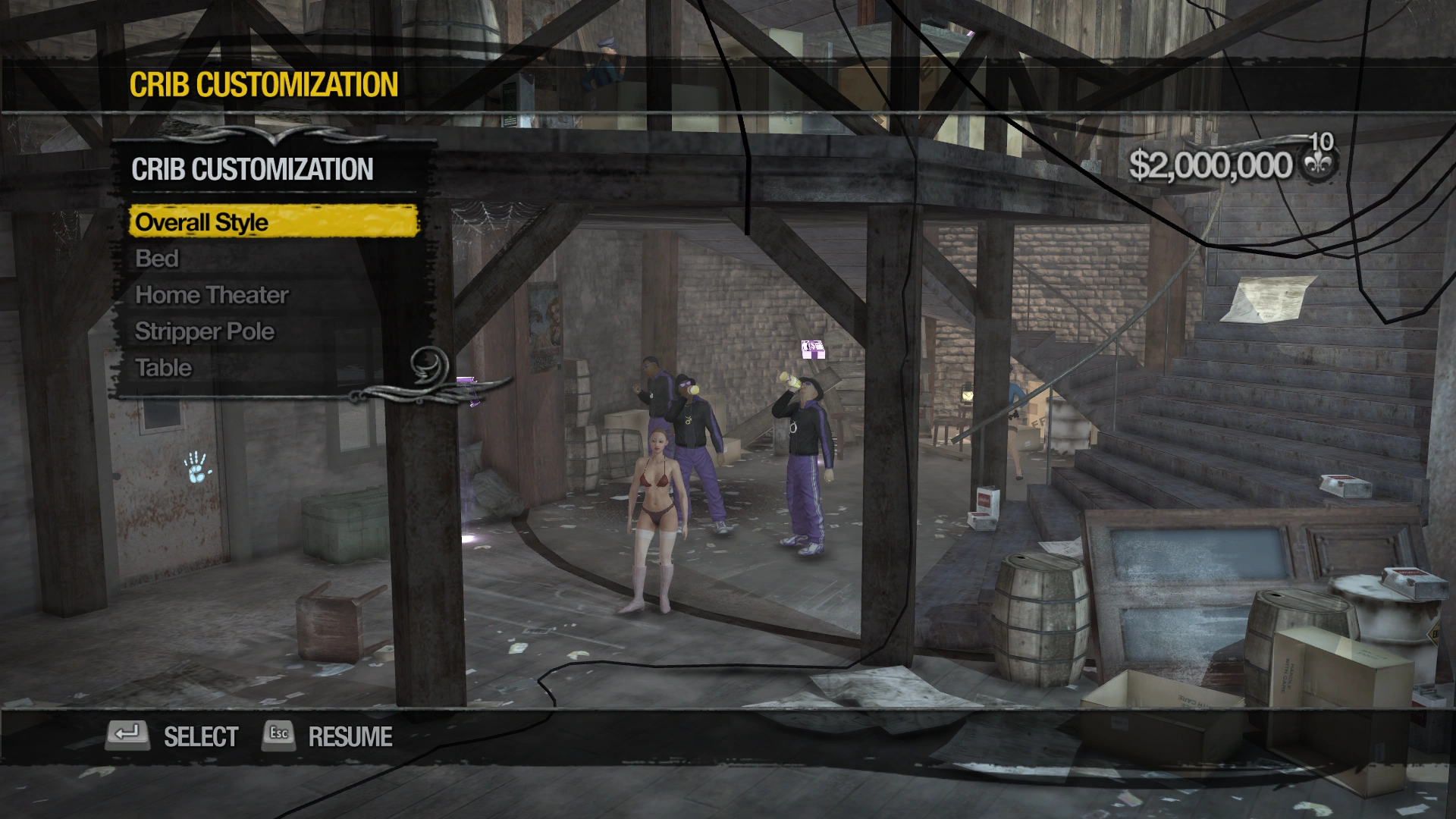 The crib features a Television, Newspaper Clipboard, Wardrobe, Weapons Cache, Stash, Crib Customization, a radio, and a car garage, but no Dock.