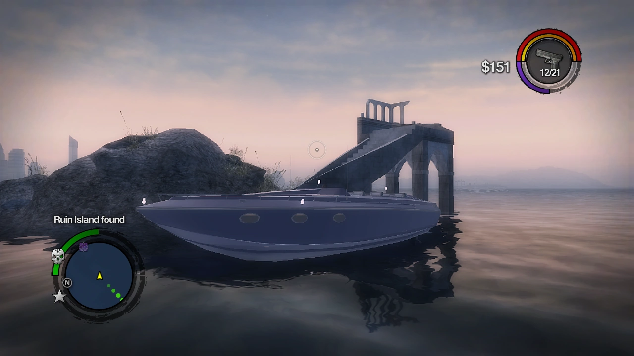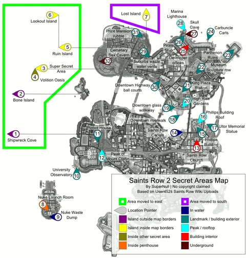 There are 32 Secret Areas in Saints Row 2. Upon reaching each location for the first time, a "(location name) found" message is displayed on-screen, but they are not indicated on the Map, and there are no visual indicators apart from the initial on-screen message.