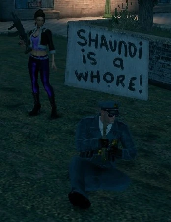 - As the story progresses, protesters begin to appear that are against the 3rd Street Saints, and various Saints billboards are defaced. Some of the picket signs the protesters hold say "Shaundi is a whore!" and "No Saints in Steelport".[7]