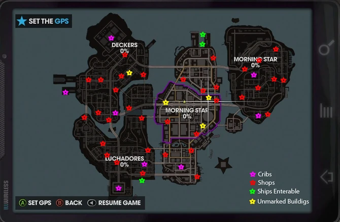 Similar to Stilwater, the city of Steelport is separated into several districts and neighbourhoods, and each district consists of three to six neighborhoods. Each neighborhood is further split into unnamed City Takeover territories.