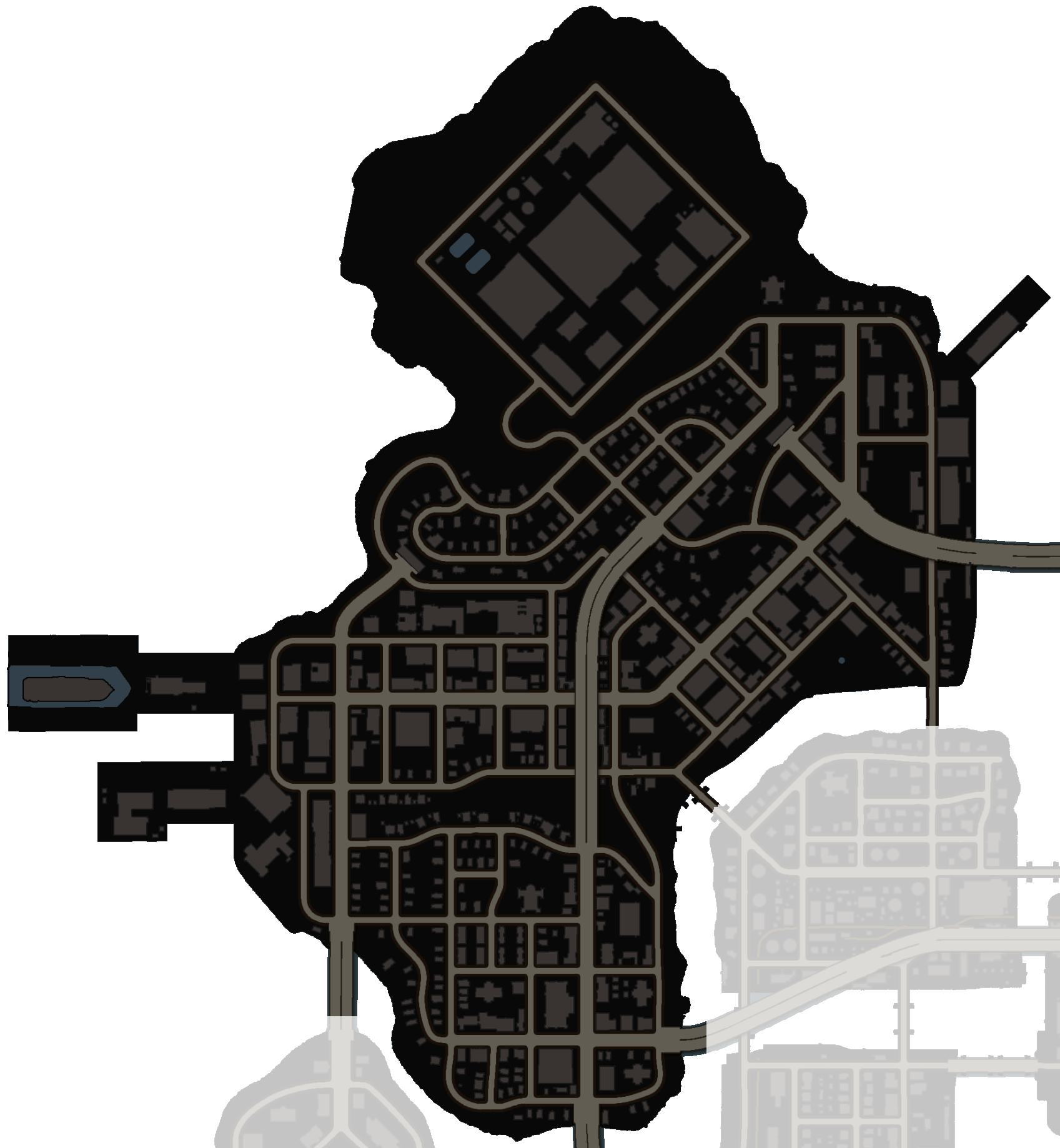 Steelport viewed from the ground on the fake Stilwater island