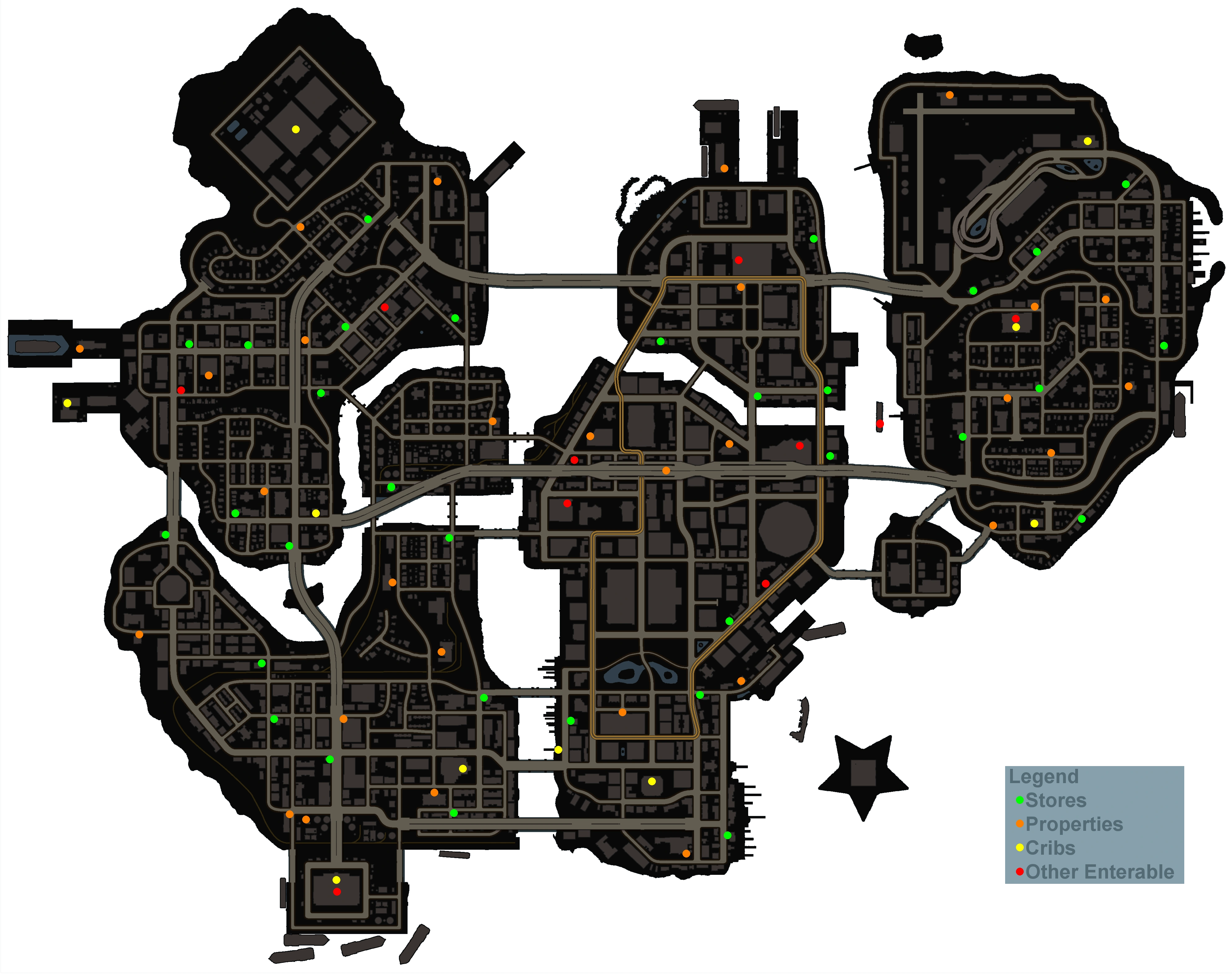 A map of Steelport, with buildings marked
